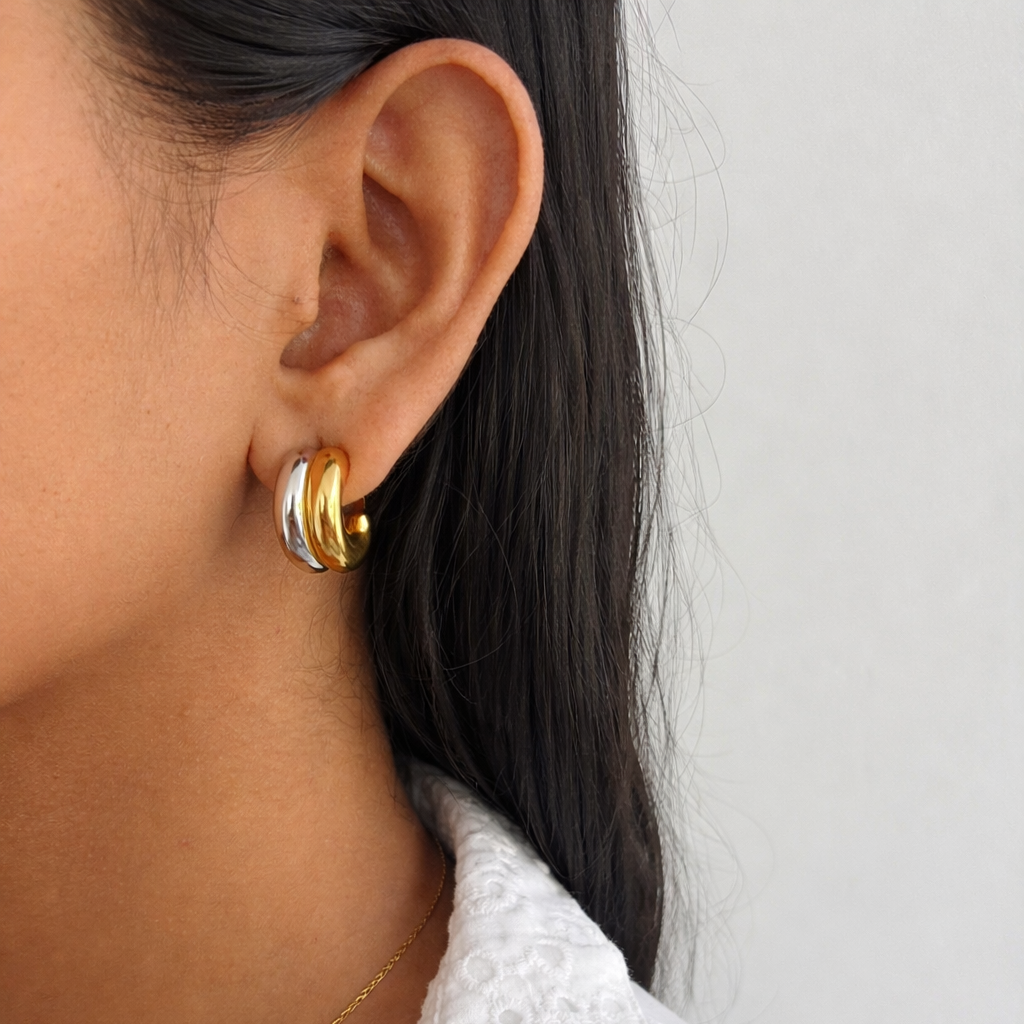 The Luxe Fusion Hoops feature a bold dual-tone curved silhouette that blends gold and silver tones into a modern, sculpted statement. Crafted from premium 316L stainless steel and finished with durable 18K PVD coating, they are designed to retain their shine without fading or tarnishing.
