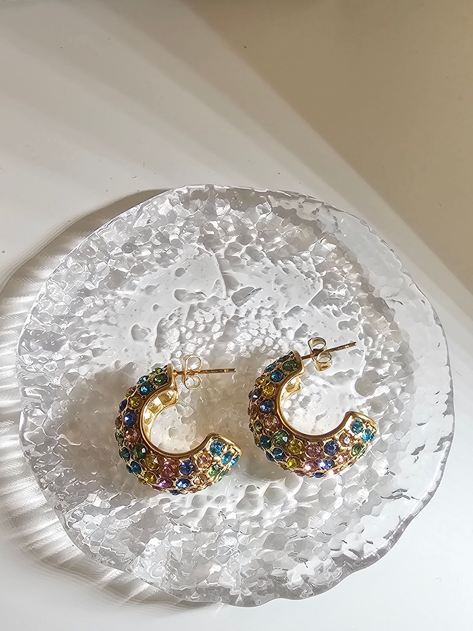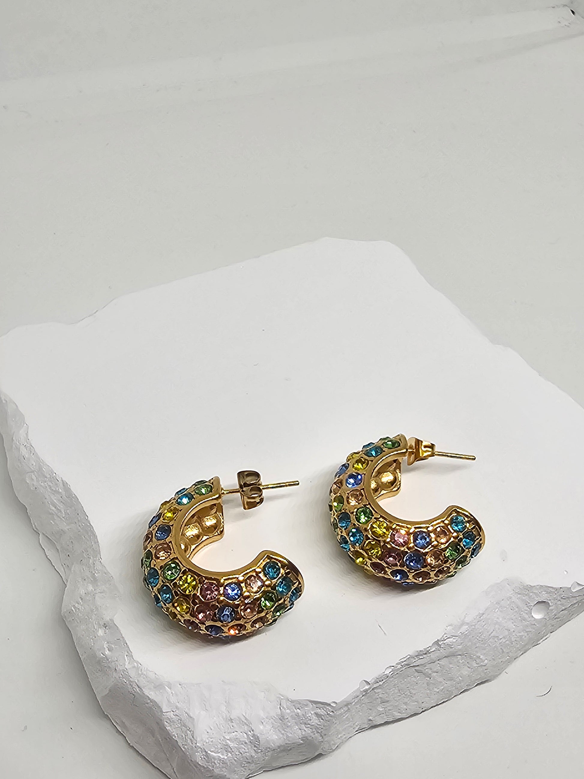 Diese Creolen aus Edelstahl mit wasserfester PVD-Goldbeschichtung sind anlauf- und feuchtigkeitsbeständig und glänzen dauerhaft. Die regenbogenfarbenen Steine sind präzise eingesetzt, um das Licht aus jedem Winkel einzufangen und Ihrem täglichen Schmuck einen fröhlichen Glanz zu verleihen.